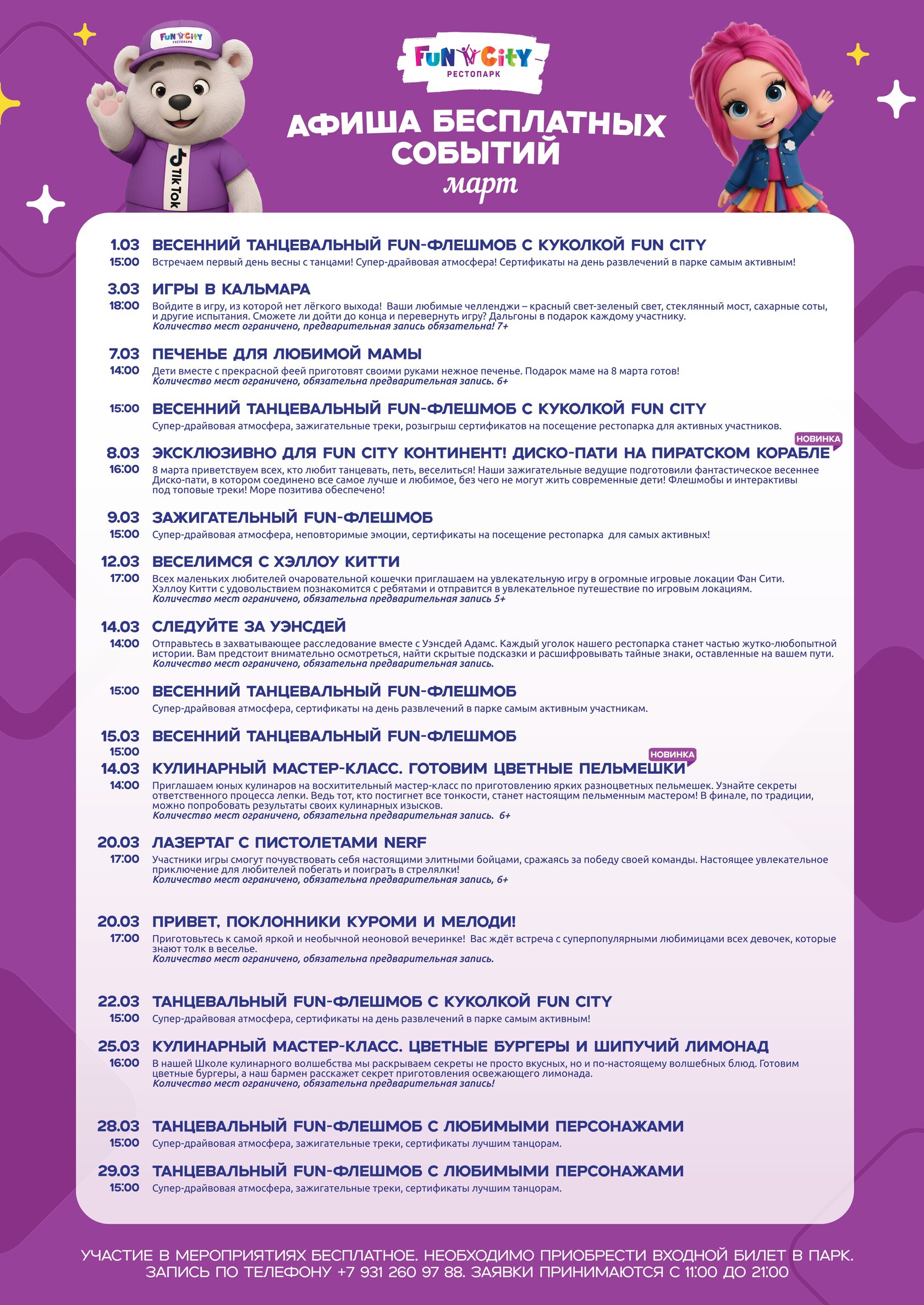 *Участие в мероприятиях бесплатное, необходим только входной билет в парк. На отдельные мероприятия необходима предварительная запись: